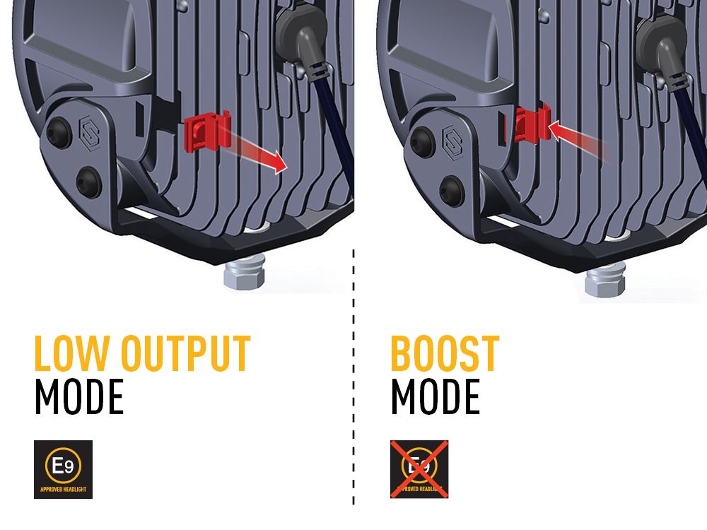 Les lampes Sentinel Black et Chrome de la gamme « Standard » offrent les mêmes performances d'éclairage. Avec 9 529 lumens bruts, elles délivrent 1 lux à plus de 700 m, un résultat impressionnant en soi. Compte tenu de l'angle de faisceau horizontal de 52 degrés, ce produit a été conçu pour offrir une visibilité maximale, sur route comme en tout-terrain. Comme tous les produits Lazer, sa température de couleur agréable de 5 000 K est agréable à l'œil et optimise la netteté et la définition des objets situés devant. Homologuée CEE-ONU conformément au règlement 112 comme feu de route, cette lampe adopte la technologie E-Boost à double sortie de Lazer. À 100 %, le flux lumineux dépasse la limite autorisée par la réglementation CEE. Le retrait du capuchon Boost fourni à l'arrière de la lampe réduit donc le flux lumineux à la limite autorisée.
