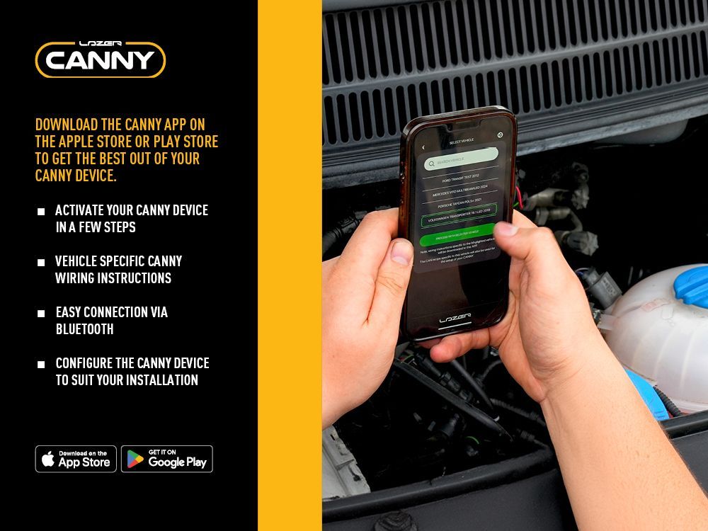 CANNY is a CAN interface, developed by Lazer Lamps, that enables installation of auxiliary lights for selected vehicles using CAN communication systems, where it is otherwise not possible to pick up 12V lighting signals at the back of the vehicle headlamp, for example. Comprising a CANNY dongle, plus wiring loom, and supported by a dedicated app (CANNY.LZR), the system benefits from being able to mount within your vehicle’s engine bay for faster and easier installation, or inside the vehicle. Over-the-air Bluetooth synchronisation and updates further the system's ease of use and speed of installation.
