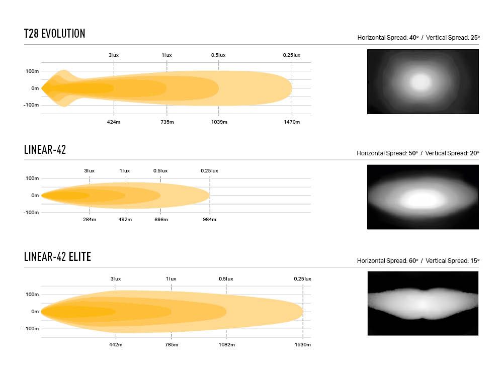 The Linear-42, with its low profile aerodynamic design is the perfect choice for customers looking for a more discreet LED driving light roof install, with the added benefit of superior low wind noise at high driving speeds. Despite the smaller proportions of the light, lighting performance is still exceptional with the beam pattern matching excellent distance illumination (Standard: 1 lux at 492m, Elite: 1 lux at 765m), with a spread of light to the left/right of the road that leaves nothing to the imagination. The Linear-42 (Standard model only) also falls within UNECE regulations allowing the lamp to be connected to your standard high beams (where local regulations allow).